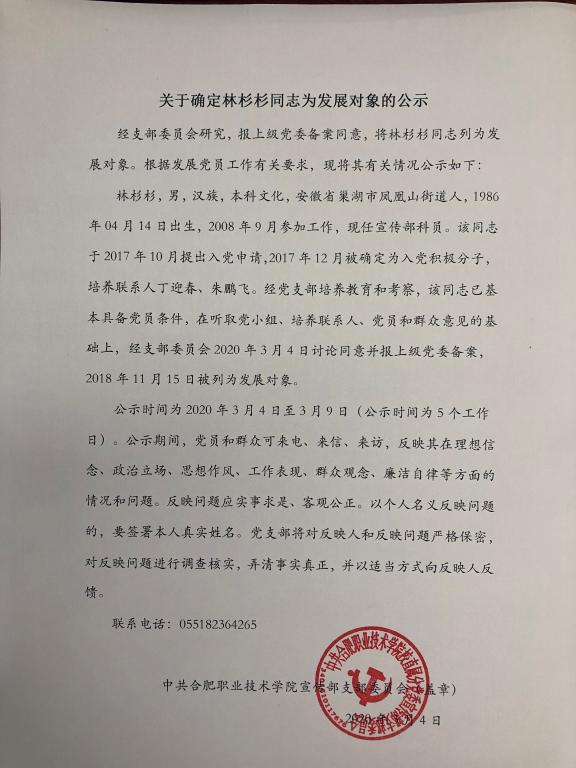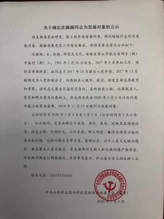 關于確定沈婉婉、林杉杉為發展對象的公示