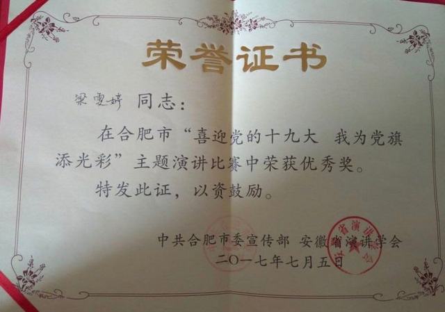 7月5日上午,中共合肥市委宣傳部,安徽省演講學會主辦的“喜迎黨的十九大,我為黨旗添光彩”主題演講比賽在合肥政務中心8號會議室舉行,我院團委梁雯婷代表我院參加了本次比賽,此次比賽梁老師緊扣演講主題,結合自身工作實際及從身邊的實際,通過演講形式娓娓道來,塑造了一個個立足崗位,無私奉獻的典型形象,充分展示了合肥職業技術學院黨員教師積極向上的精神風貌,經過激烈的角逐梁雯婷老師最終獲得“優秀獎”,為我院增光添彩!(供稿:宣傳部 編輯:敬涓)